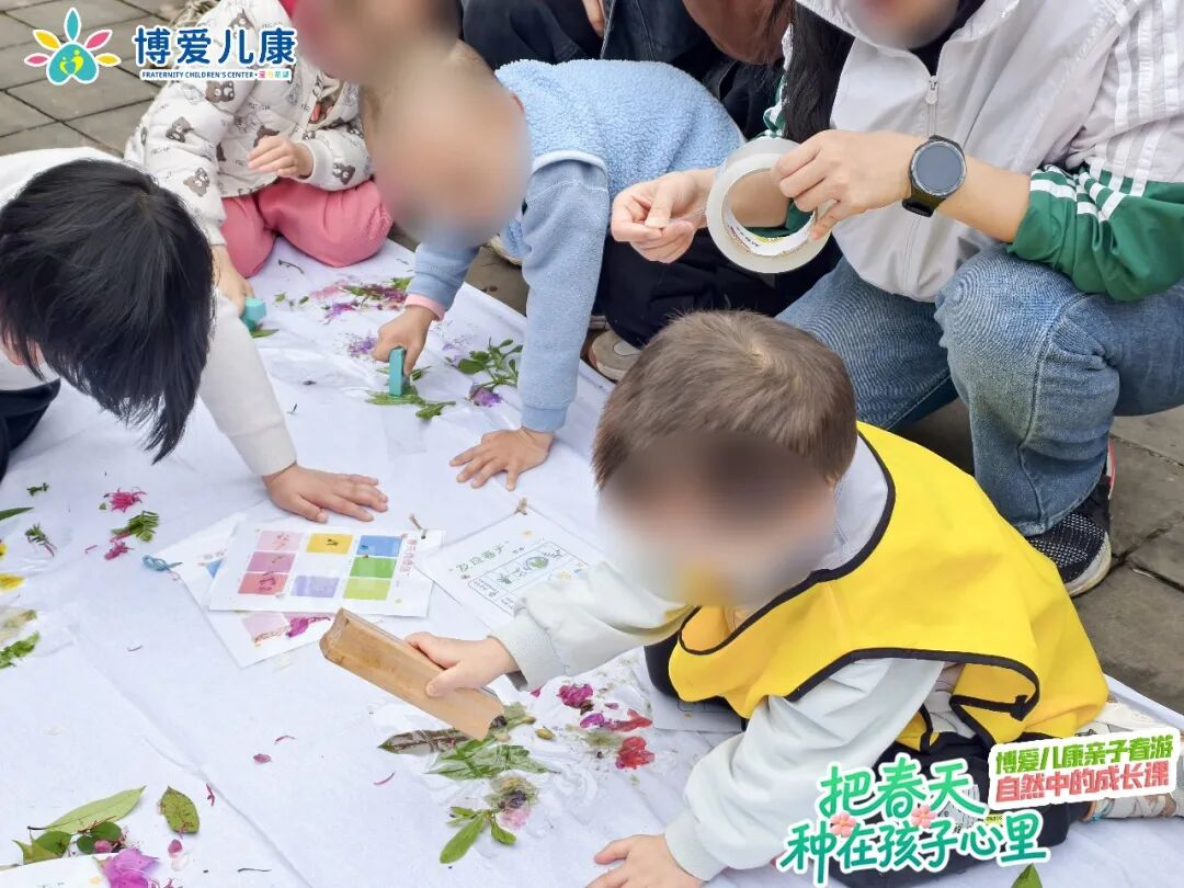 寻宝活动结束后,博爱儿康的老师们拿出一张长长的空白“画布”。孩子们将收集来的各种绿叶、花瓣等,充分发挥自己的想象力,在白布上摆出各种各样的图案,用透明胶带固定,用小鹅卵石轻轻敲击,春天的颜色和脉络便一点点在这张画卷上展现。